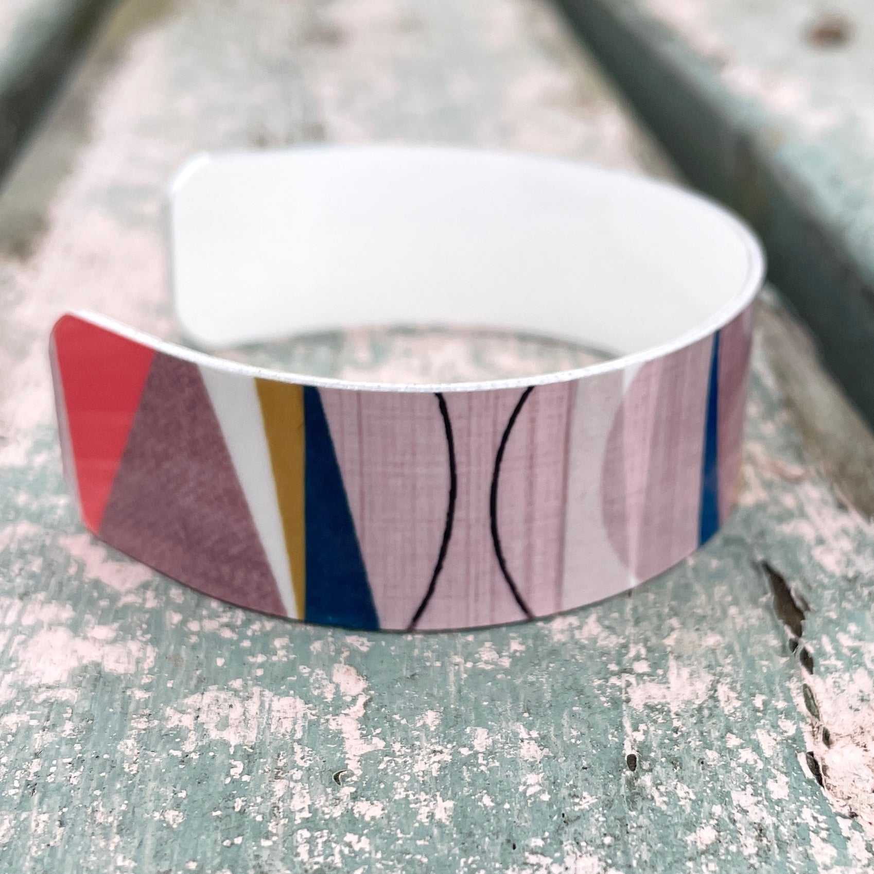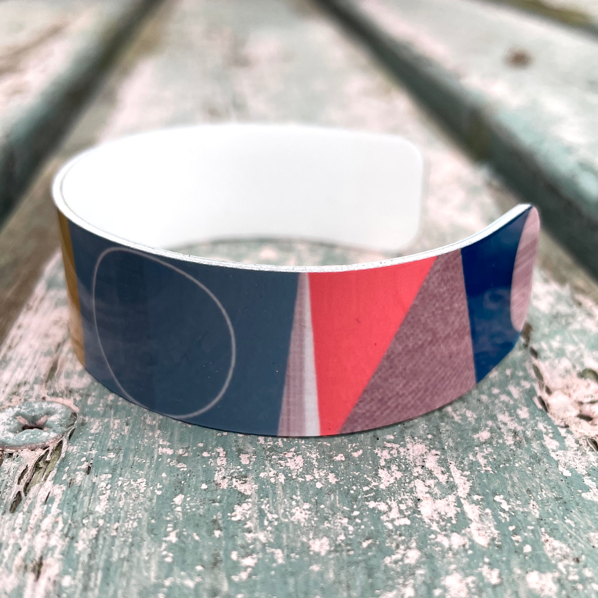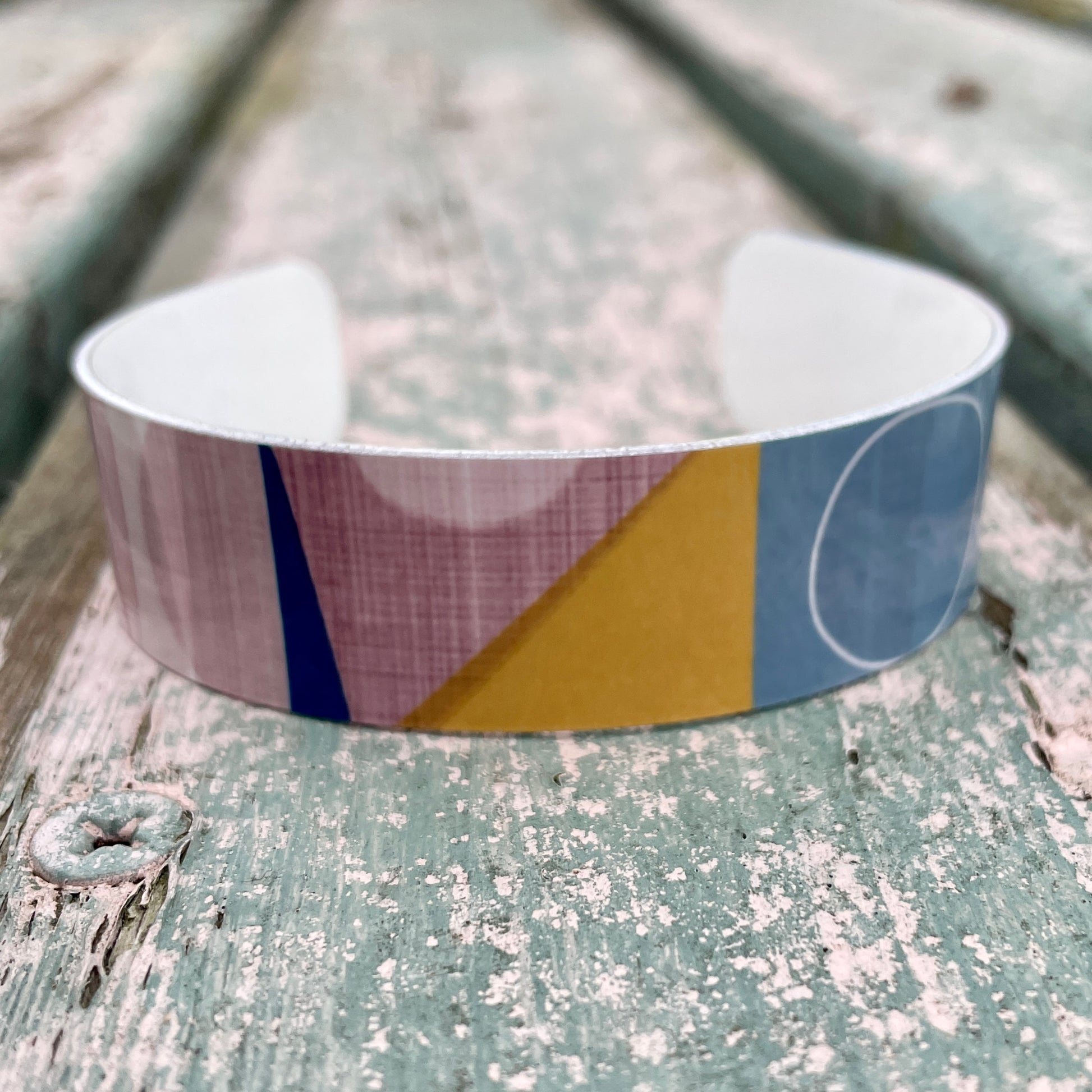 A hand printed cuff bracelet, featuring sections of block printed designs.