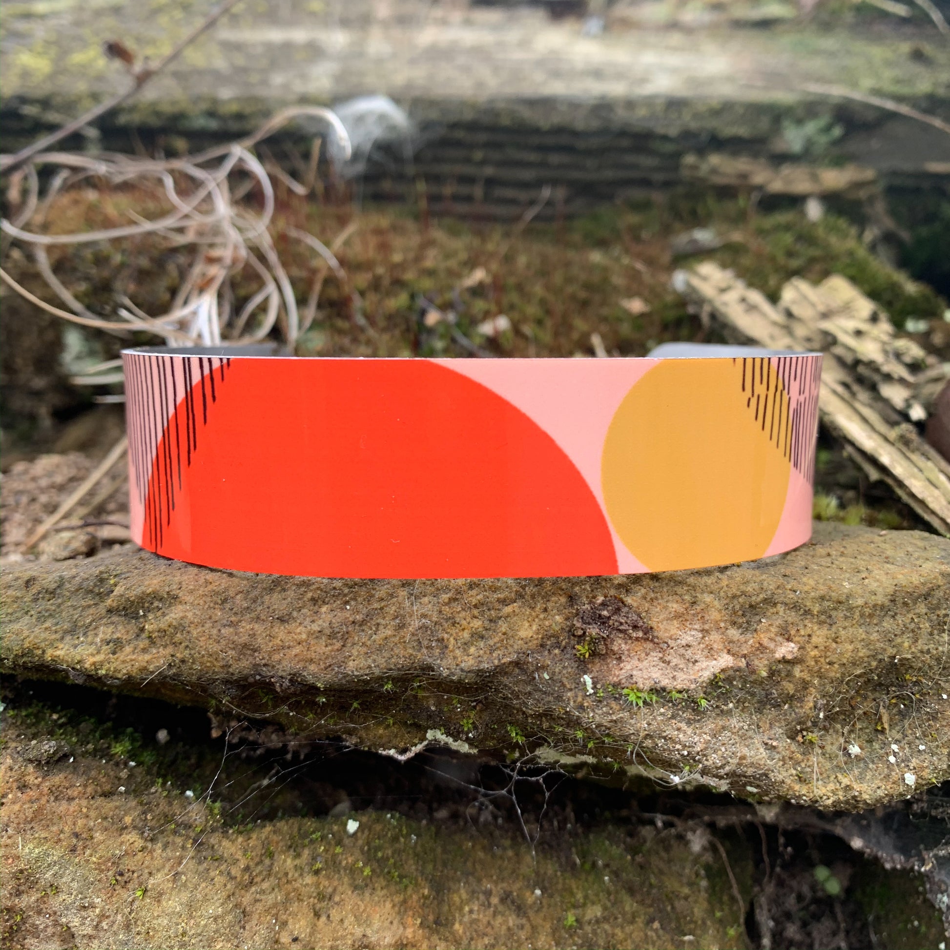 Hand printed statement cuff bracelet featuring vibrant sections of printmaking designs.