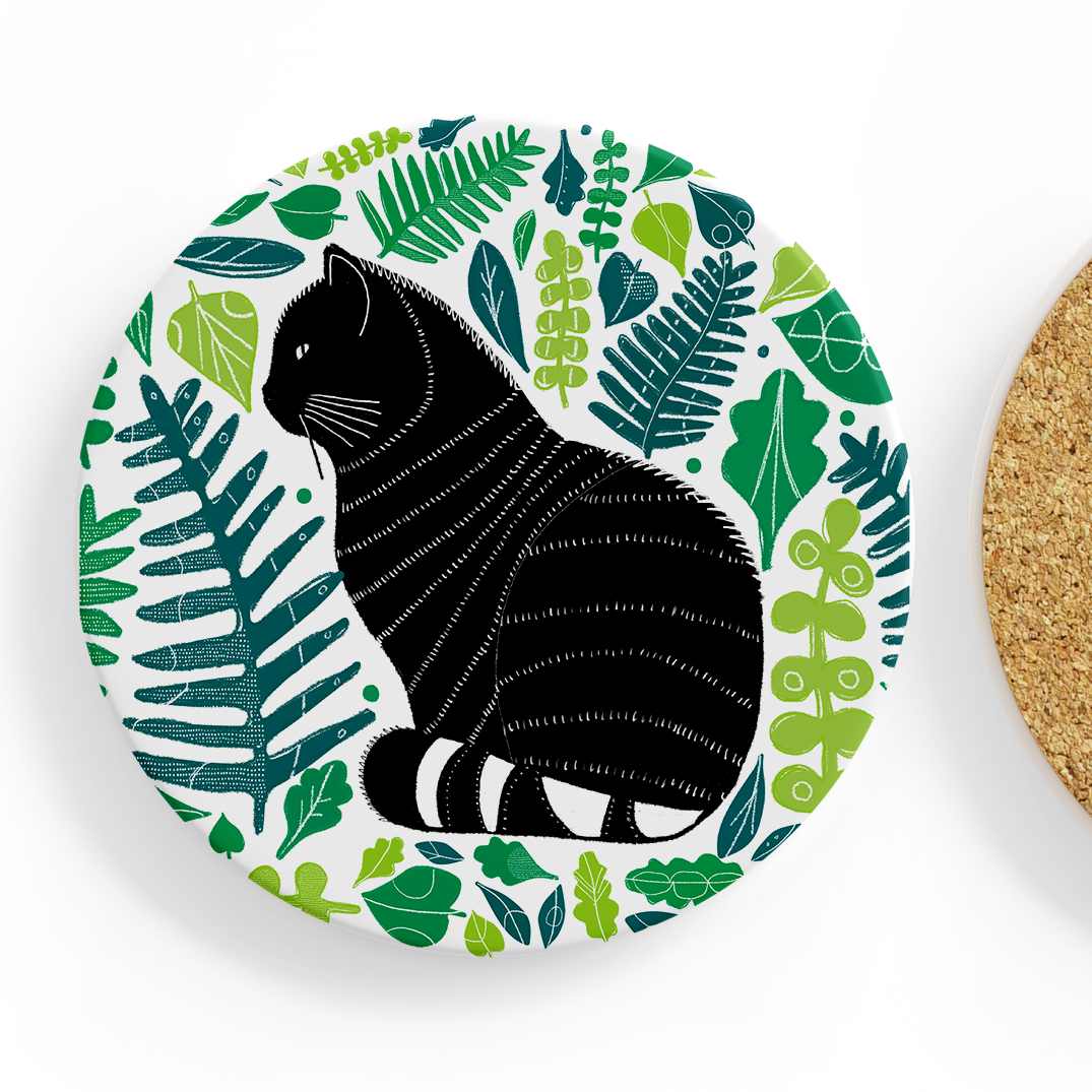 A glossy, round ceramic coaster. Individually printed in Jenni's studio.