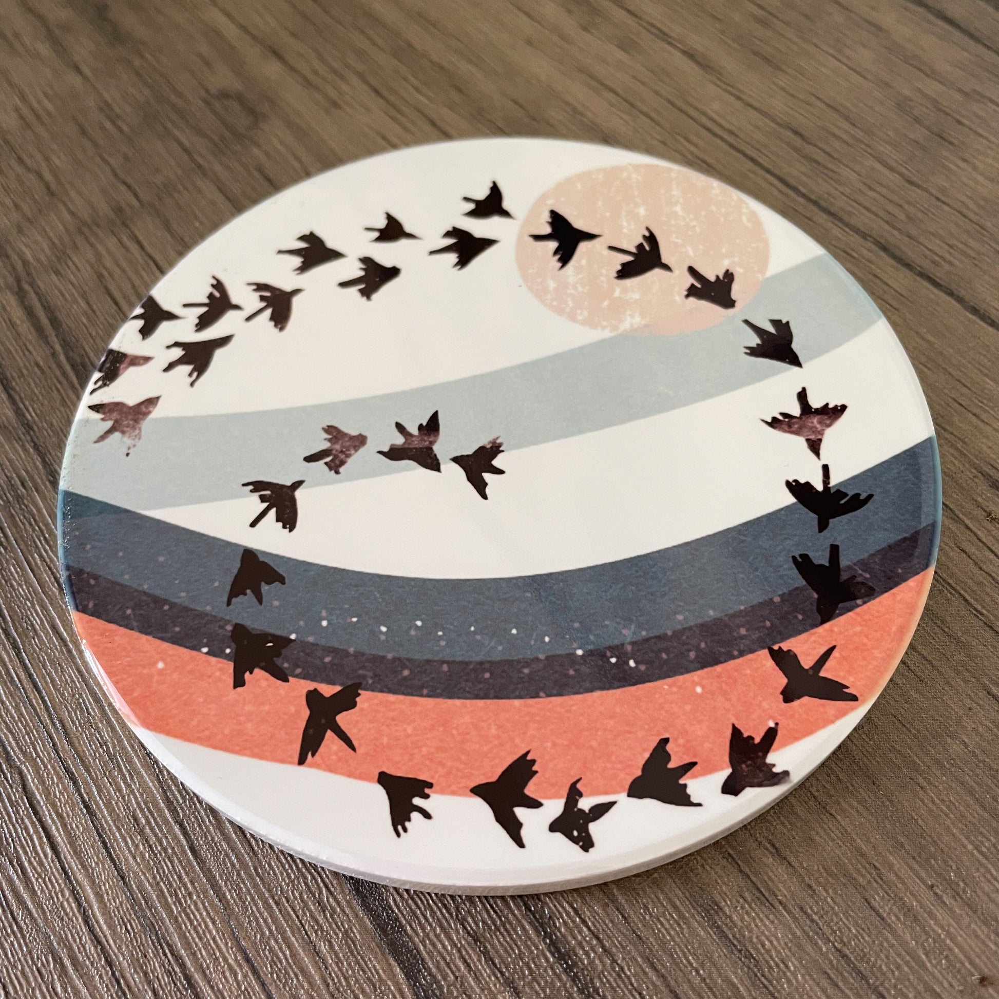 A glossy, round ceramic coaster. Individually printed in Jenni's studio.